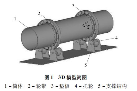 本文以某款谷物類烘干機(jī)為研究對象,烘干機(jī)一般包括干燥系統(tǒng)、上料系統(tǒng)、熱風(fēng)爐系統(tǒng)、出料系統(tǒng)、引風(fēng)系統(tǒng)、控制系統(tǒng)與安全系統(tǒng)。干燥系統(tǒng)是其最為關(guān)鍵的系統(tǒng),主要組成部件為筒體、輪帶、墊板、托輪和支撐結(jié)構(gòu),其中筒體、墊板和輪帶都為設(shè)備運行過程中主要的受力部件,且易發(fā)生失效,而托輪和支撐結(jié)構(gòu)所受為體積力,均布于整個結(jié)構(gòu)系統(tǒng),一般不會發(fā)生應(yīng)力失效。